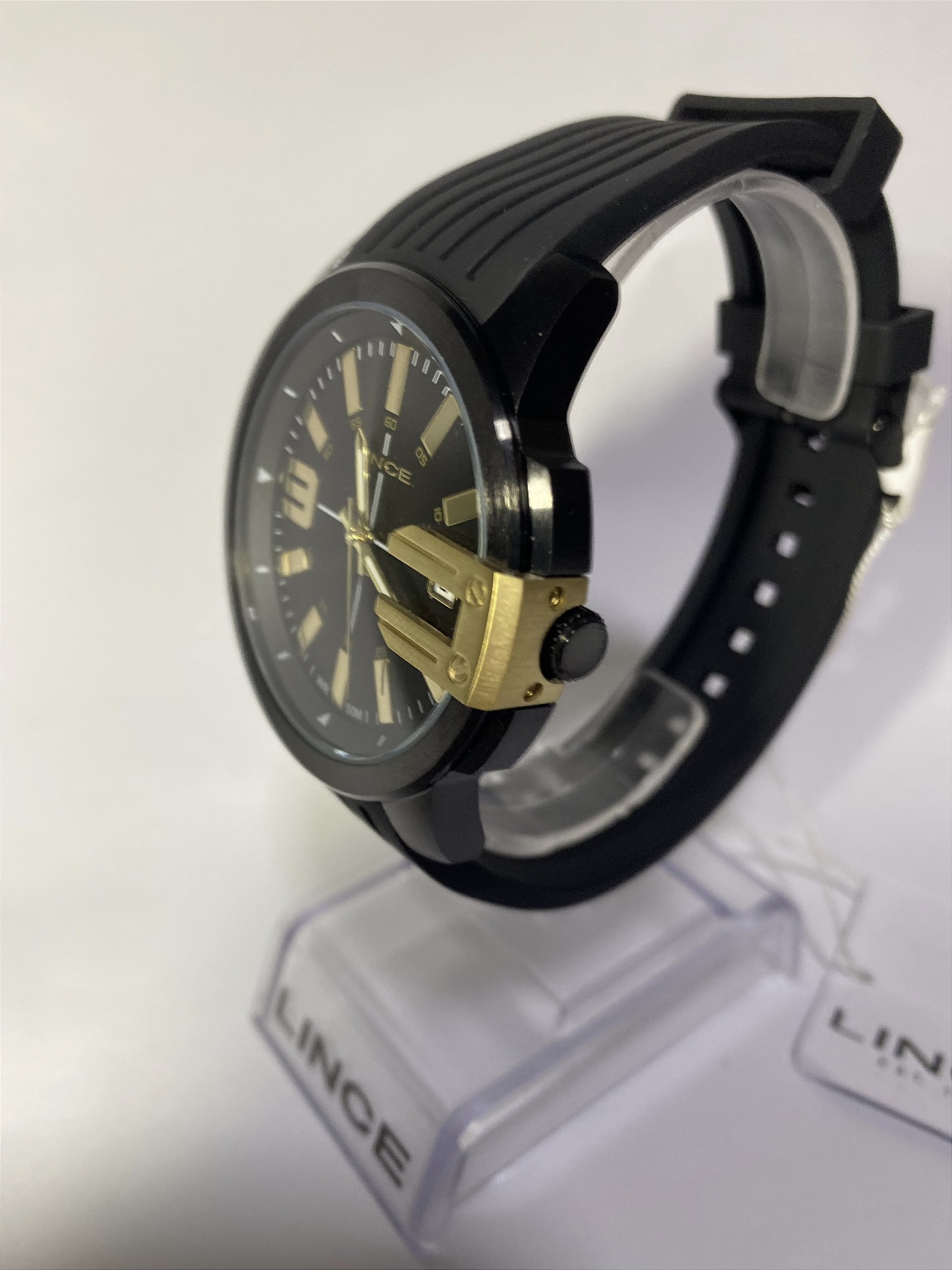 Marca:Lince Gênero:Unissex Visor:Preto Linha:Masculino Vidro:cristal mineral Funções:Calendário Pressão:50M Características:com caixa preta e pulseira em silicone Diâmetro da Caixa:48 mm